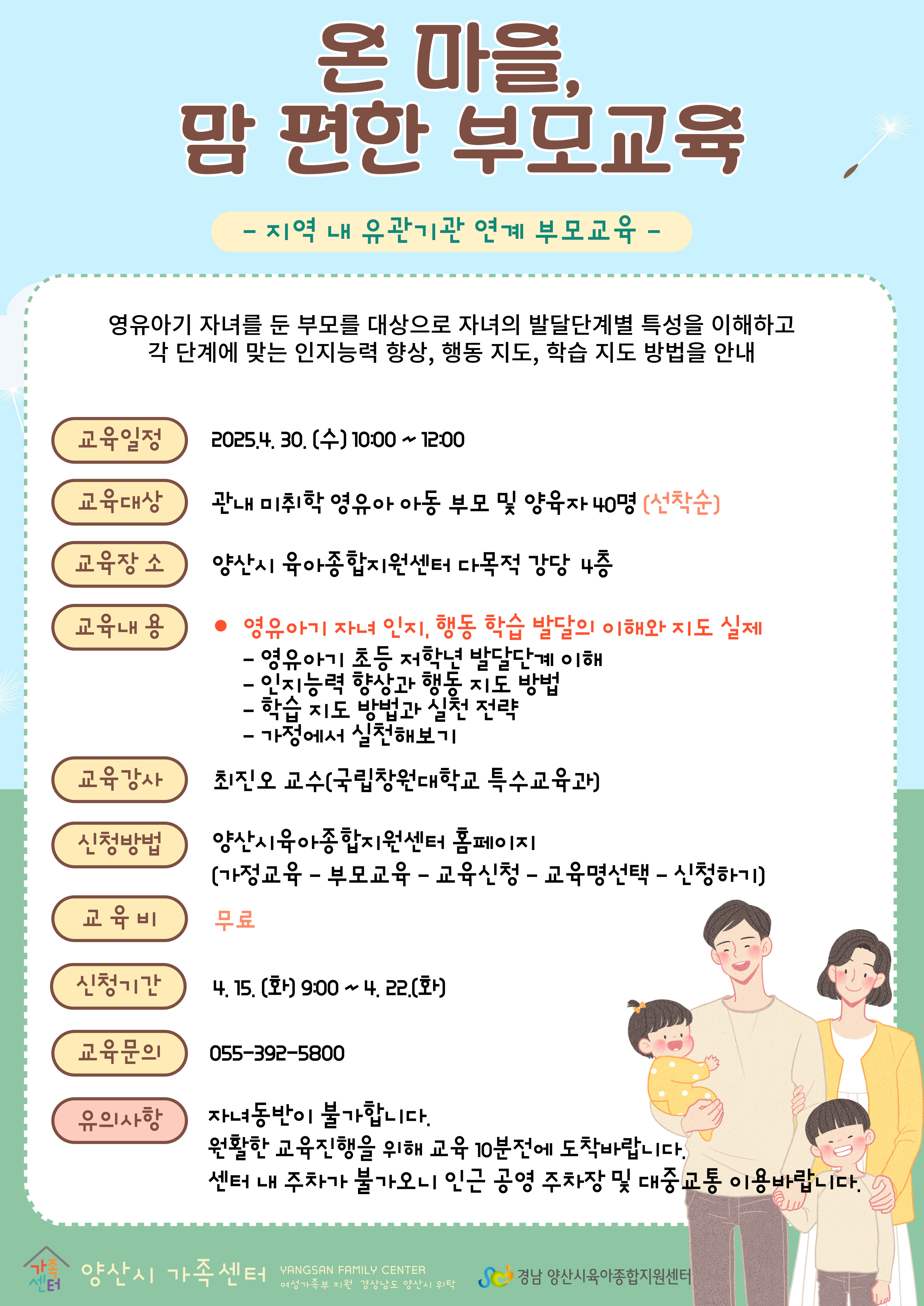 | 부모교육 - 부모교육(영유아기 자녀 인지, 행동, 학습 발달의 이해와 지도 실제) | 양산시가족센터와 연계하여 부모교육을 진행합니다. 많은 관심과 신청바랍니다. |
