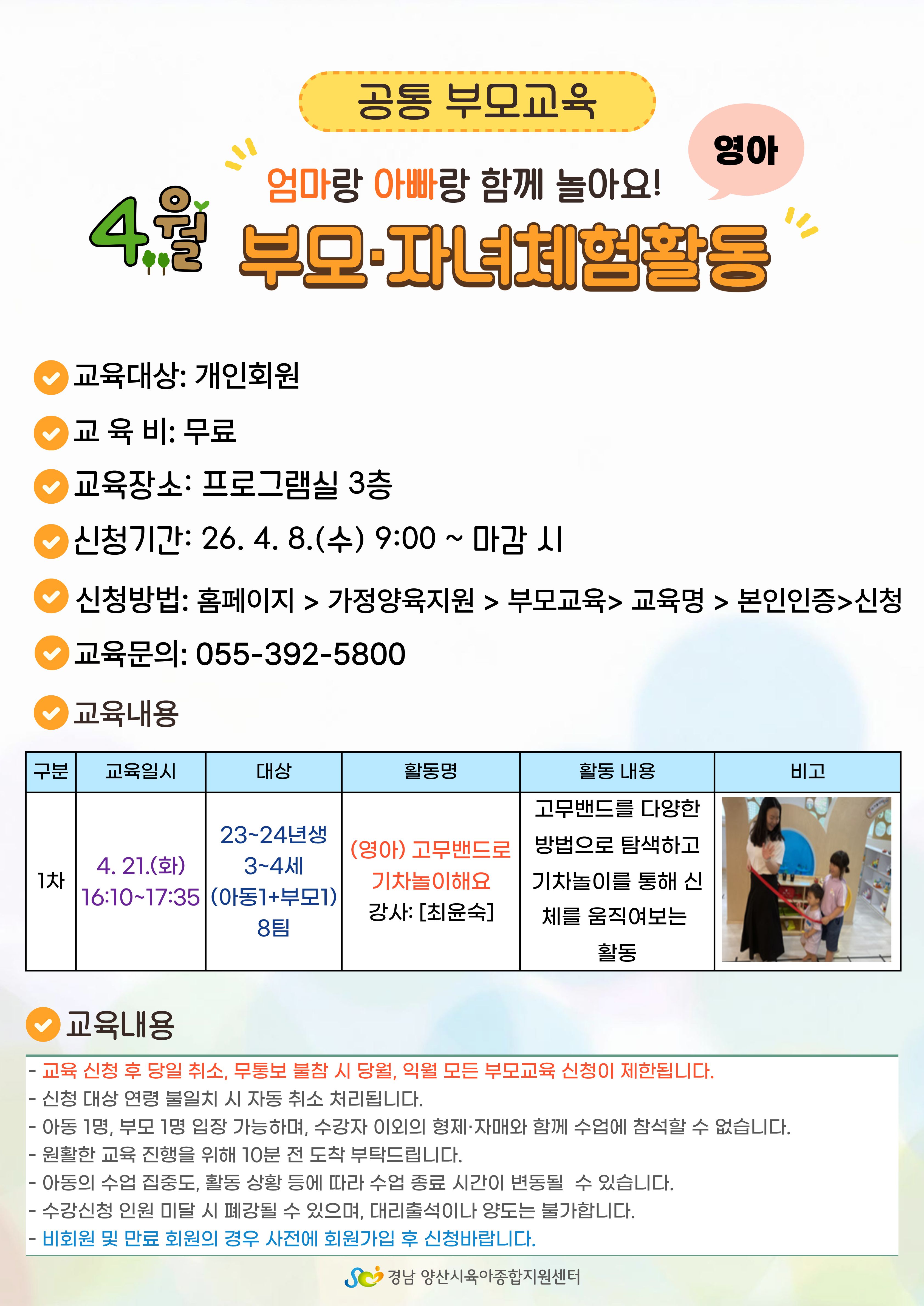 | 부모교육 - 4월 1차 부모-자녀 체험활동 안내(고무밴드로 기차놀이해요) 영아 3~4세 | - 엄마와 아빠랑 함께 할 수 있는 회원대상(무료) 프로그램입니다. - 교육 신청 후 당일 취소, 무통보 불참 시 당월, 익월 모든 부모교육 신청이 제한됩니다. ※ (필수) 회원성명, 연락처, 회원번호 모두 일치하게 작성해주세요. ※ 프로그램 종료일까지 회원자격 유지 대상자 신청 가능 ※ 비회원 및 만료 회원의 경우 사전 회원가입 후 신청 가능 - 영·유아 1인, 부모1인만 참석 가능합니다. - 대상 연령에 맞게 신청해 주세요.(불일치 시 신청 자동 취소) - 대리출석이나 양도는 불가합니다. - 원활한 수업 진행을 위해 수업시간을 준수 부탁드립니다. - 수강신청 인원 미달 시 폐강될 수 있으며, 대리출석이나 양도는 불가합니다. |