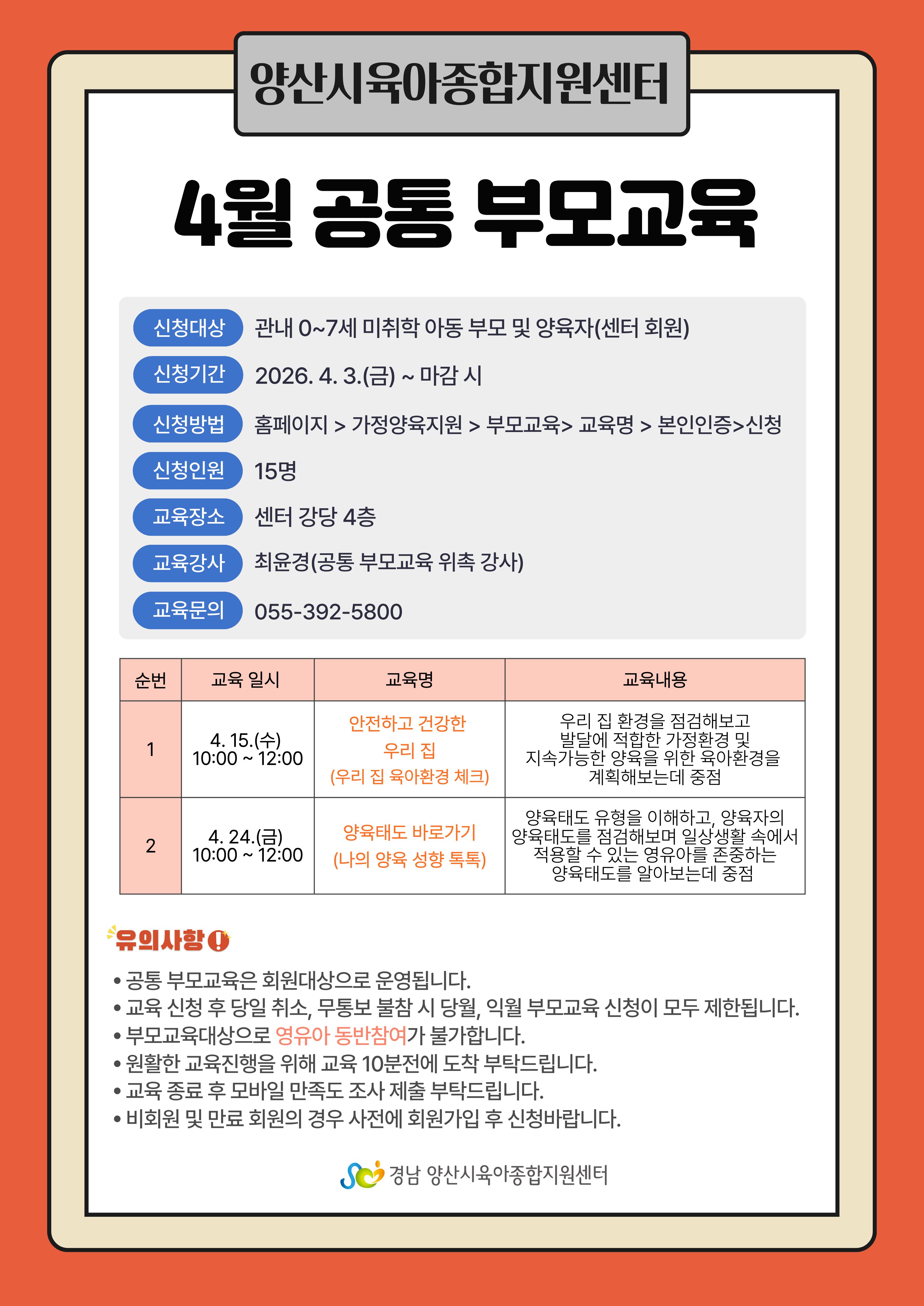 | 구분 | 4월 공통부모교육 [안전하고 건강한 우리 집] | 진행현황 | 접수중 |