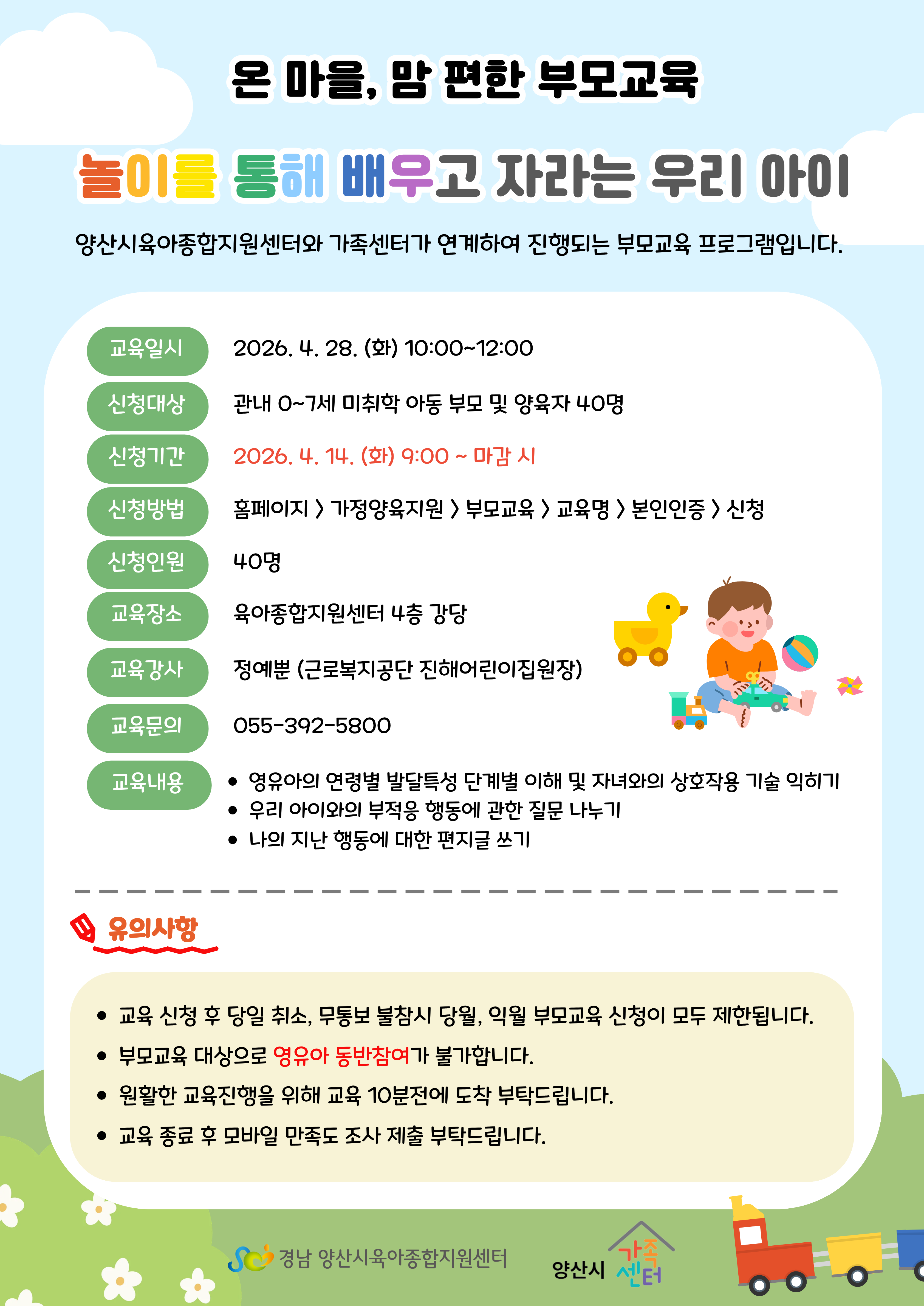 | 교육대상 | 관내 미취학 아동 부모 및 양육자(비회원 가능) | 교육정원 | 40 |