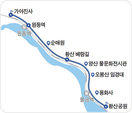 자전거길 곳곳엔 특별한 매력들이 숨어 있다. 낙동강 둔치엔 울긋불긋 야생화들이 드넓게 물들어 있어 라이딩 내내 눈이 즐겁다. 또 강물 위로 난 데크길이 많아 마치 기차가 된 것처럼 독특한 리듬을 만들어내며 자전거를 탈 수 있다. 특히 코스 중 베랑길은 낙동강변의 절벽을 깎아 만든 ‘벼랑길’이라 짜릿한 라이딩이 가능하다. (베랑: 벼랑의 방언, 황산강: 낙동강의 삼국시대 명칭)
