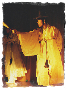 - 조선시대 양반의 평복차림으로 양반 갓·양반 망근·흑색 도포피·황색 도포·백색 바지저고리·백색 버선에 왼손에는 장죽을 들고, 오른손에는 합죽선을 든다.