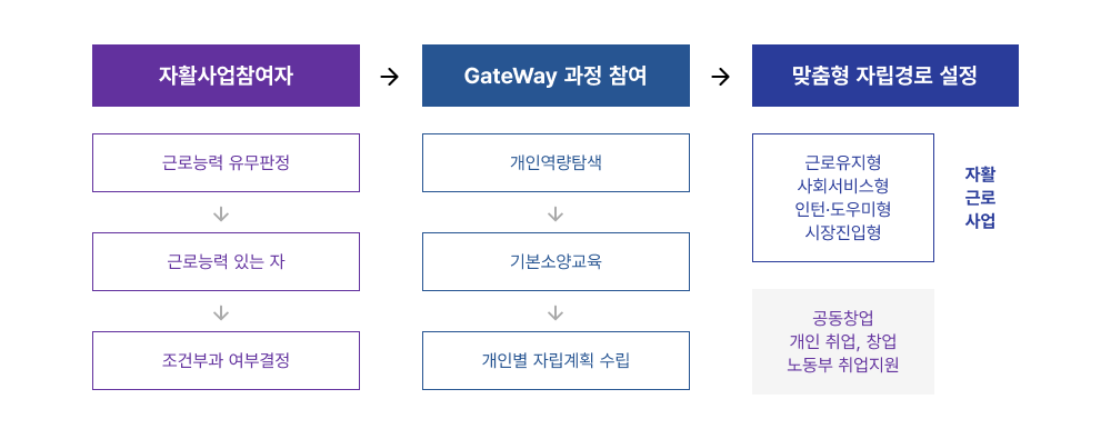 - 자활근로사업 참여 이전 GateWay과정 단계에서 개인별 맞춤형 자활경로 설정 및 체계적 지원을 통해 자활터전 마련